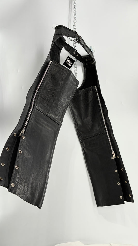 Vintage AMERICAN LEATHER Black Motorcycle Chaps/Pants with Mini Pocket, and Side Zipper Detailing (XS)