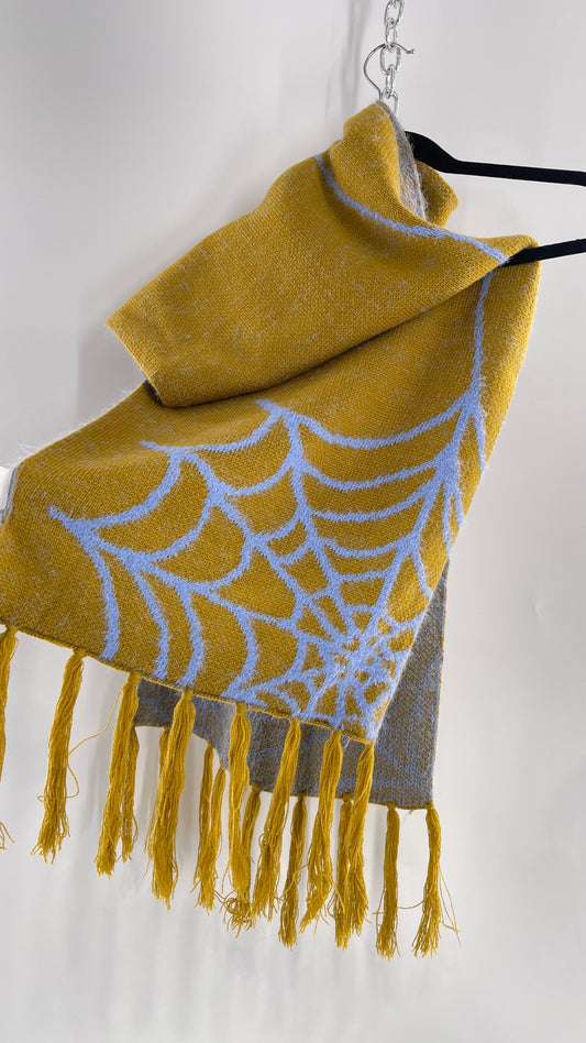 Free People Yellow Green Thick Knit Scarf with Powder Blue Spider Web Graphic