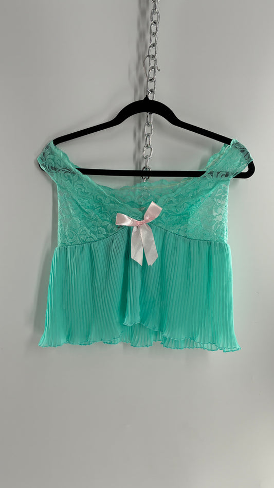 DREAMGIRL Vintage 1990s Teal Wide Neck Babydoll Camisole with Baby Pink Bow (Medium)