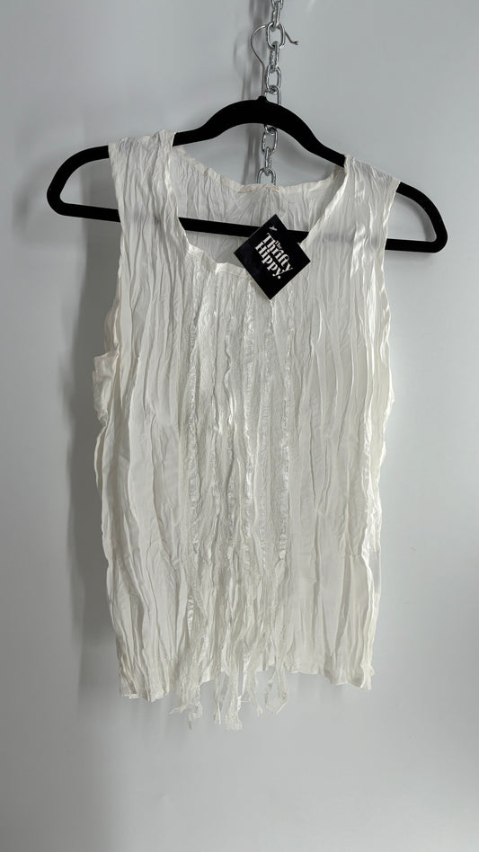 Vintage 1990s Crimped White Camisole with Tassels, Ribbons, and Lace (Medium)