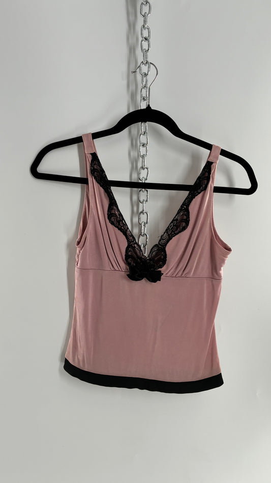 Vintage 1990s Express Dusty Pink Camisole with Black Lace Details and Bow Bust (XS)