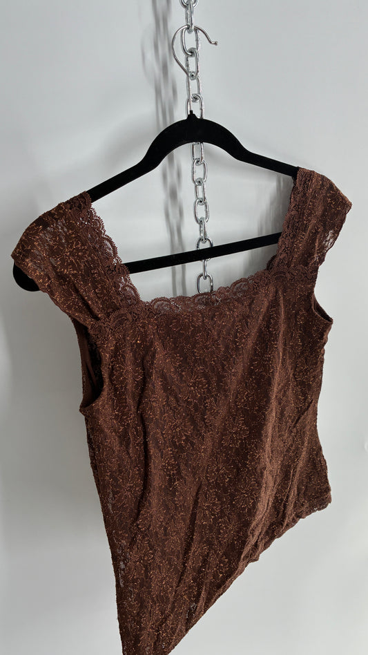 Vintage 1990s Brown Gold Tinsel Lace Straight Neckline Top (M)