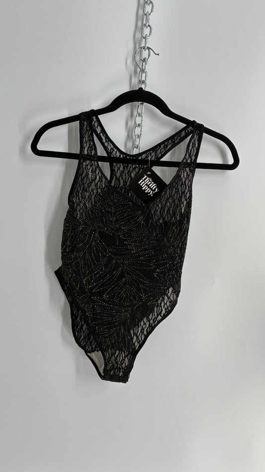 Vintage 1990s Sheer Black Bodysuit with Gold Glitter Foliage Pattern (Large)