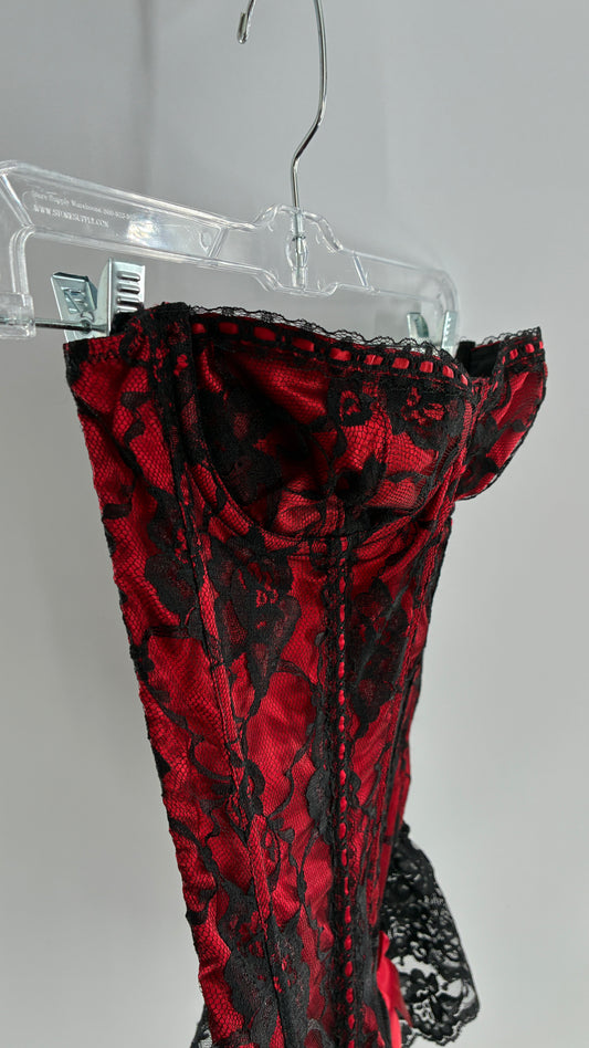 Vintage Frederick’s of Hollywood Red Black lace Overlay Corset with Bows and Ribbon Detailing (32)