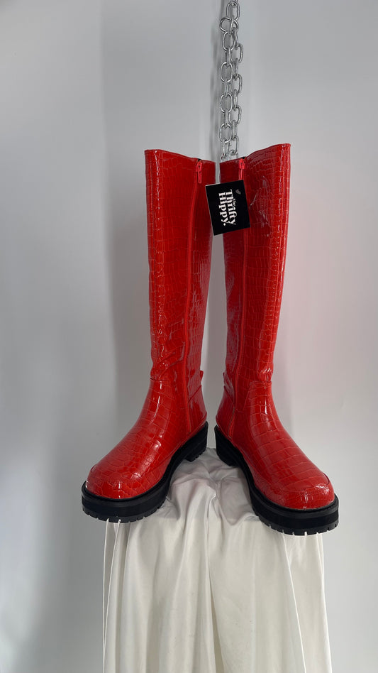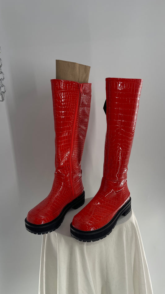 Urban Outfitters Orange Crocodile Embossed Knee High Boots (9)