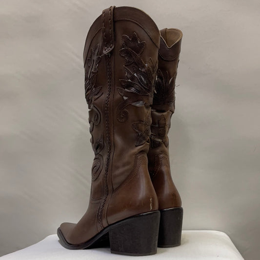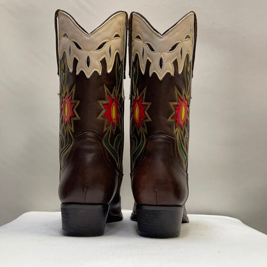 Vintage Brown Leather Cowgirl Boots Beige Trim with Red Flowers