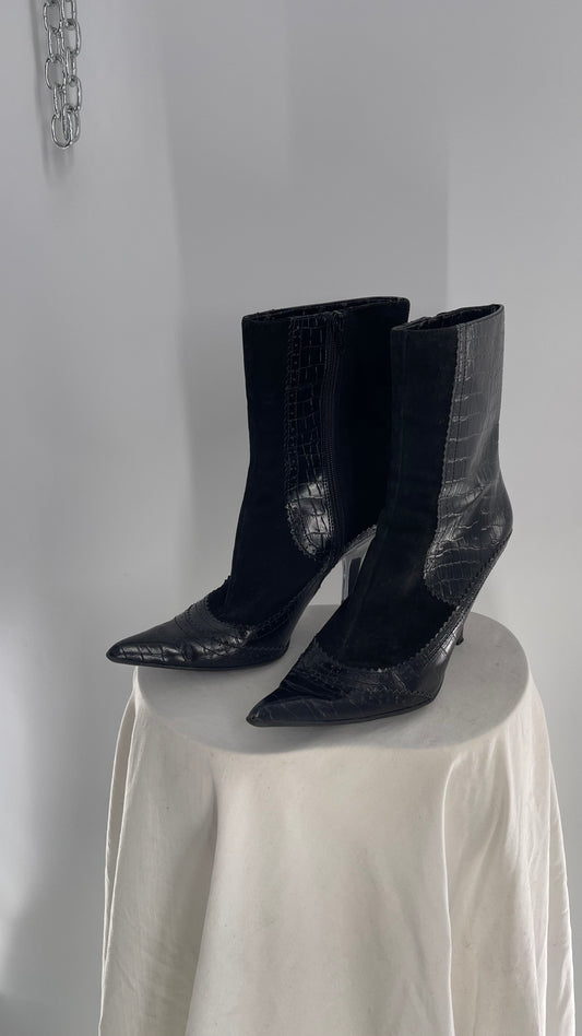 Vintage 1990s LA CANADIENNE Mixed Panel Suede and Patent Leather, Square Toe, Fur Lined Boots (10)