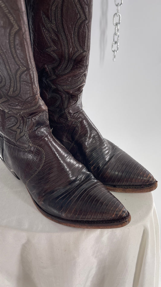 Vintage JUSTIN Dark Brown Leather/Lizard Pointed Toe Cowboy Boots Worn In (7.5)