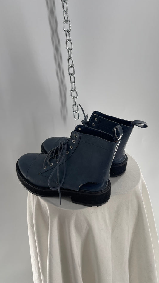 Vintage Navy Blue Vegan Leather Round Toe Heel Cut Out Combats(7)