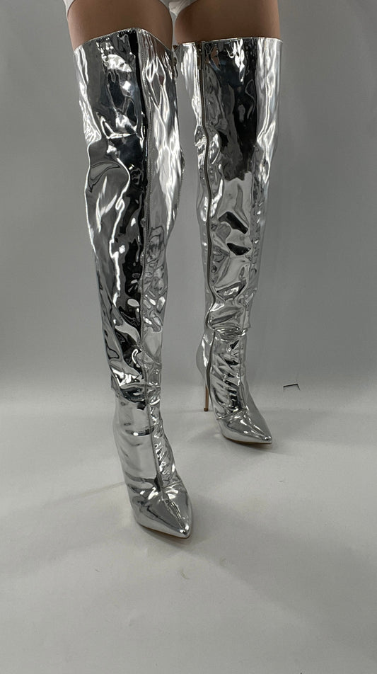 Vintage Chrome Platinum Mirrored Thigh High Molten Metal Sky High Boots Space Cadet/Concert (7)