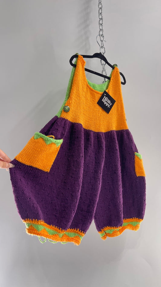 Vintage HandKnit Handmade Halloween Purple, Orange, Green Baby Overalls