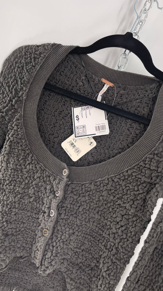Free People Charcoal Grey Textured Stretchy Knit Button Front Cropped Long Sleeve with Tags Attached (XS)