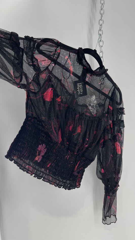 Free People Black Mesh Top with Smocked Waist, Buttoning and Contrasting Florals (Medium)