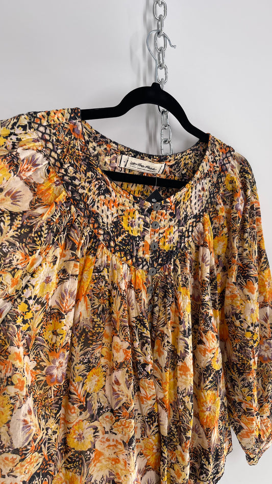 Free People Oversized Button Up Contrast Pattern Yellow Floral Blouse (XS)