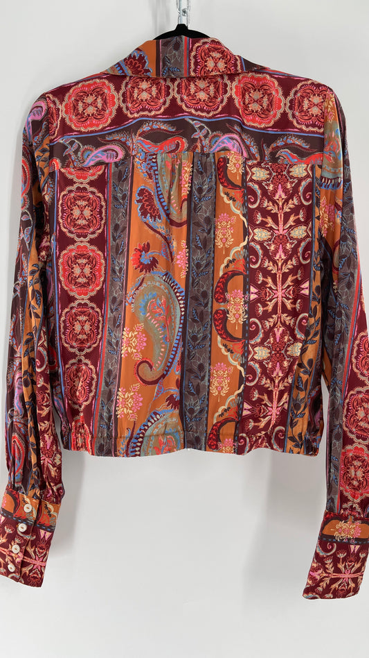 Free People Warm Tones Satin Paisley Drape Front Button Cuff Blouse (Large)