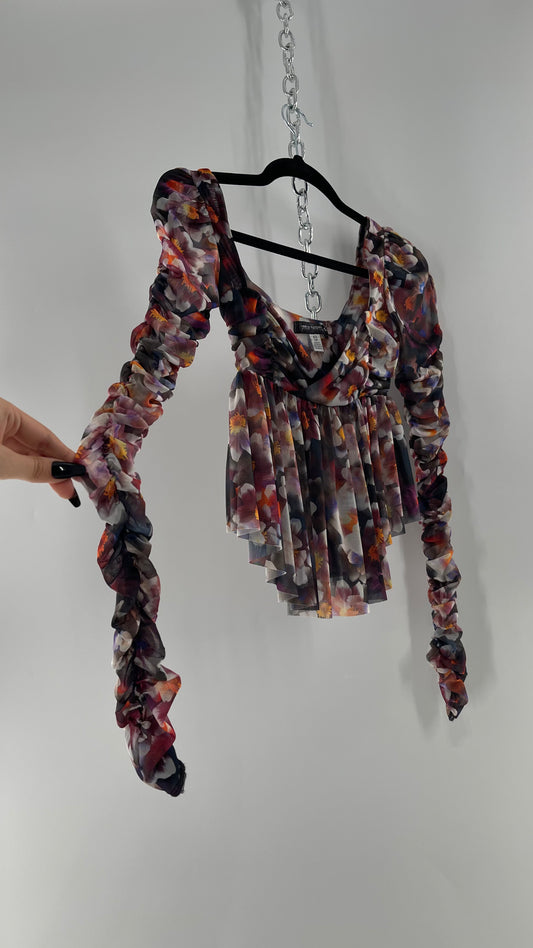 Urban Outfitters Psychedelic Floral Mesh Cropped Blouse with Ruched Sleeves and Pleated Hem (XS)