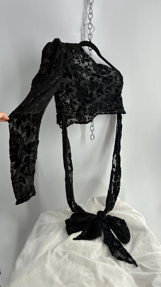 LIONESS Black Sheer Velvet Burn Out One Sleeve Tie Waist Blouse (XS)Precio habitual $38.00Precio habitualPrecio unitario por$69.00Precio de oferta $38.00Oferta