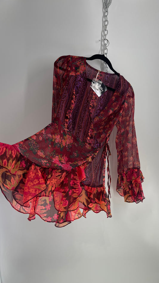 Free People Maroon/Burgundy Red Floral Tie Front Blouse with Ruffled Sleeves and Hem (Small)