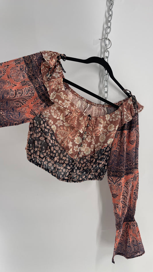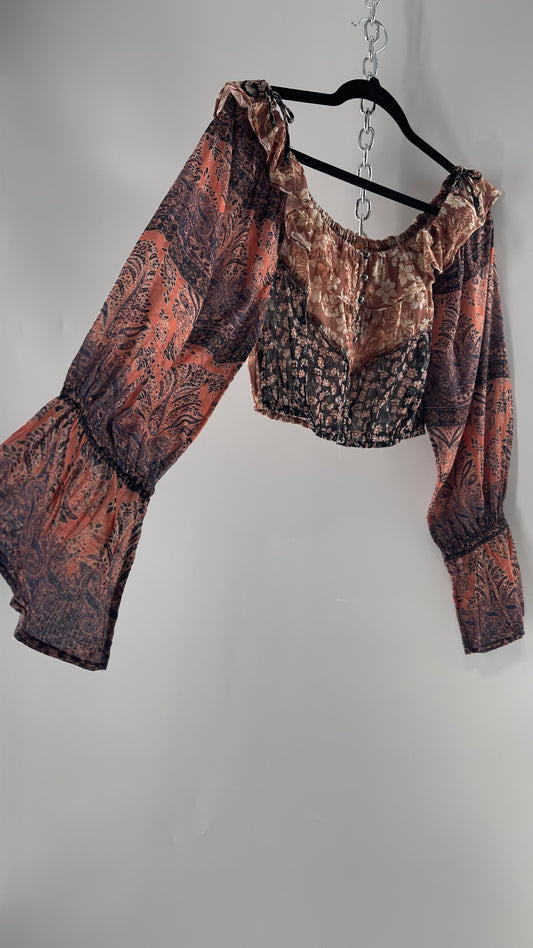 Free People Cotton Pink Blue Mixed Paisley Patterned Cropped Blouse with Bell Sleeves, Button Front and Ruffled Neckline with Bow Tie Detail (XS)