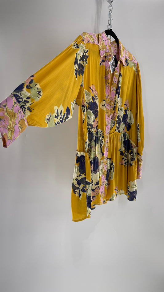 Free People Oversized Button Up Contrast Pattern Yellow Floral Blouse (XS)