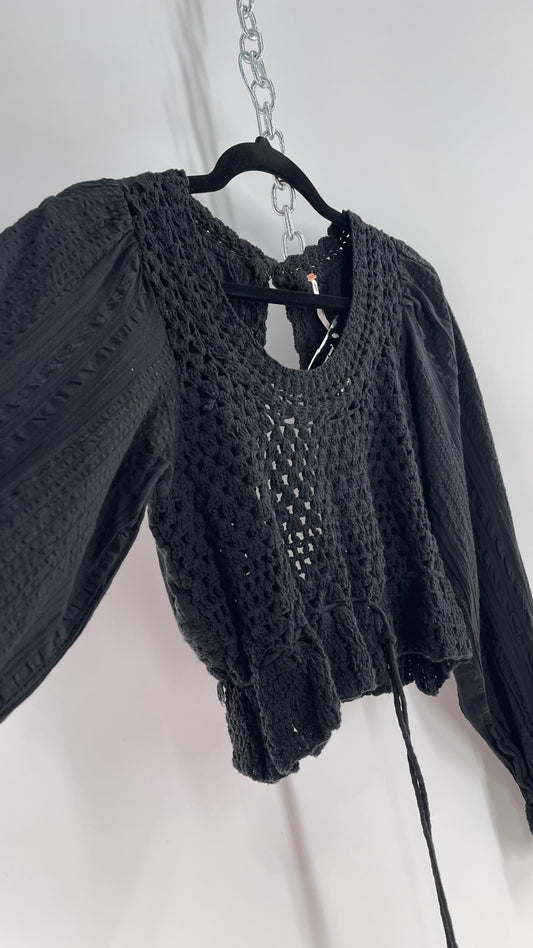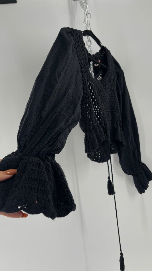 Free People Black ‘Megan’ Woven Macrame Crochet Cropped Blouse with Balloon Sleeves and Flared Cuffs (XS)