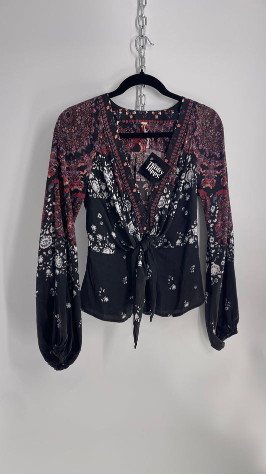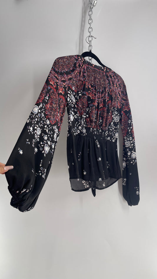 Free People Black Floral Printed Balloon Sleeve Blouse with Tie Bust (XS)