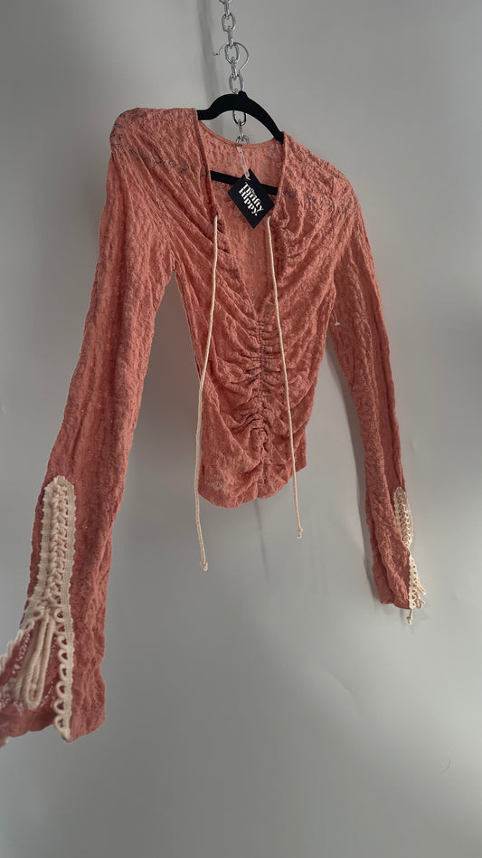 Free People Pink Lace Long Sleeve with Beige Lace Up Sleeve Detail (XS)