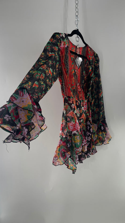 Free People Black Colorful Floral Tie Front Blouse with Ruffled Sleeves and Hem(XS)