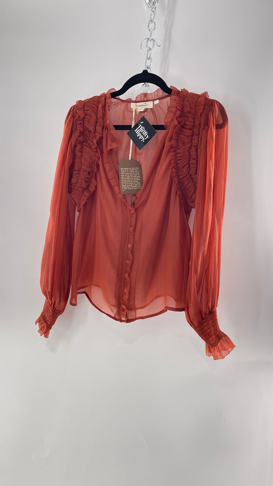 Forever That Girl Burnt Orange Shear Delicate Button Front Top with Pin Tuck Shoulder Detail and Balloon Smocked Sleeve (Medium)