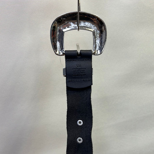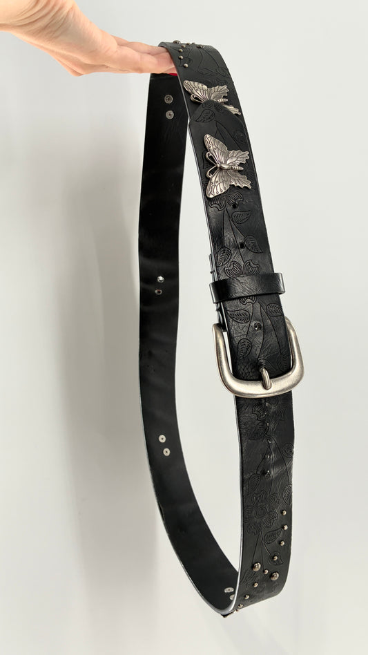 Vintage Distressed Black Embossed Belt with Silver Metal Butterfly Medallions (XL)