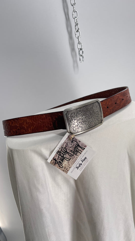 Vintage FOSSIL 1995 Embossed Genuine Leather Belt with Engraved Silver Buckle