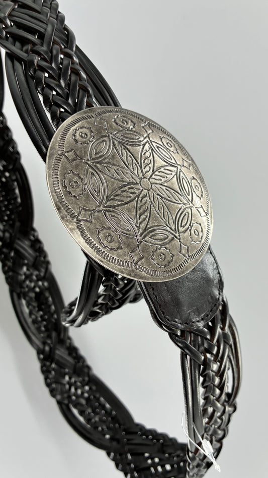 Vintage New York & Company Black Braided Leather Belt with Engraved Metal Buckle (Medium)