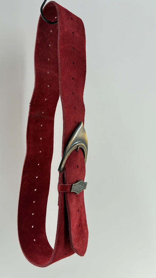 Genuine Suede Leather Maroon Red Belt w Oversized Engraved Buckle