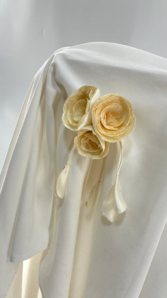 Vintage Brooch Pin: Oversized Rosette Cluster of Handmade Off White Satin and Lace Flowers with Pearl Center