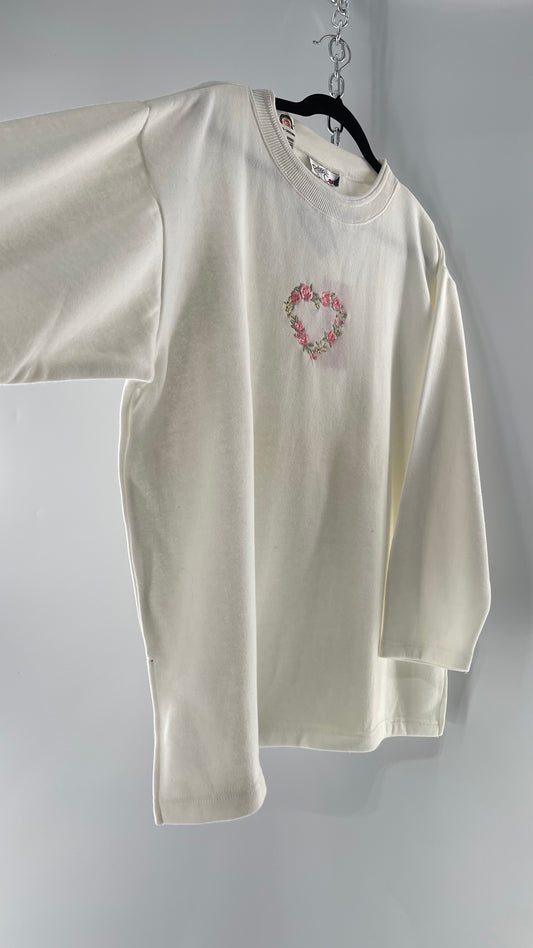 Deadstock 1990s Vintage Pebble Court Pink Rose Embroidered Heart Ivory Crewneck (Large)