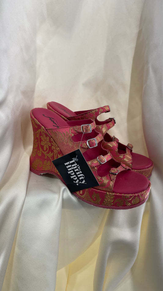 Free People Hot Pink Hoffman Buckle Front Wedge Heels with Satin Gold Paisley/Brocade Pattern (37)