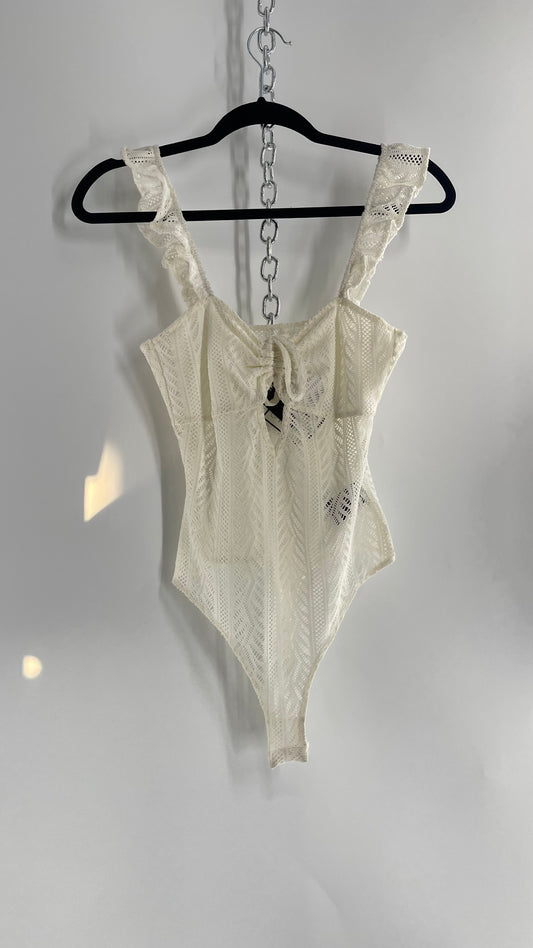 Urban Outfitters White Lace Bodysuit with Ruched Bust and Ruffle Sleeve Detail (S)