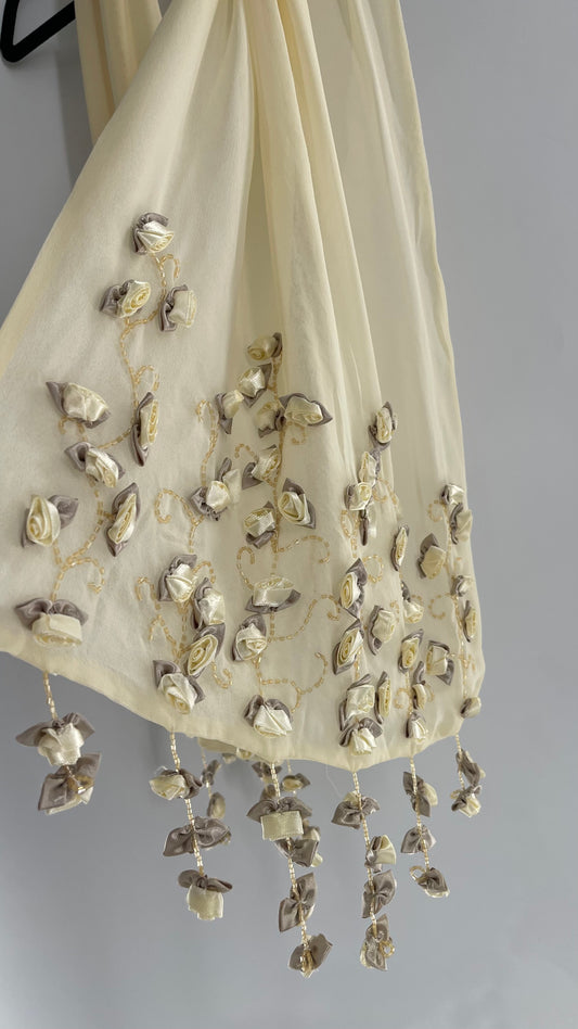 Vintage 1990s Baby Yellow Cream Silk Scarf with Embroidered Rosettes and Beaded Flowers