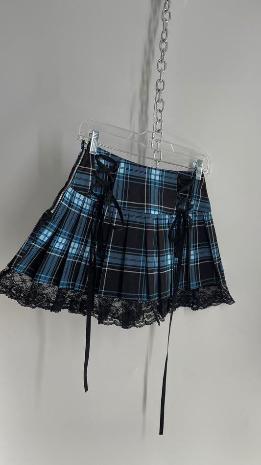 Vintage Blue Black Tartan Lace Up/Lace Trim Pleated Mini Skirt (Small)