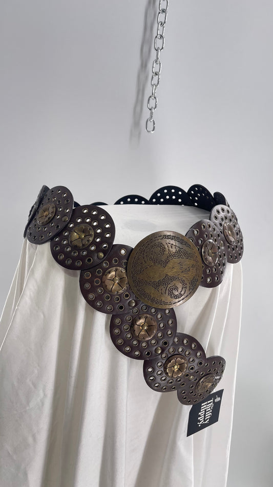 Vintage 1990s Oversized Concho Circle Belt with Grommets and Embossed Metal Flowers (One Size)