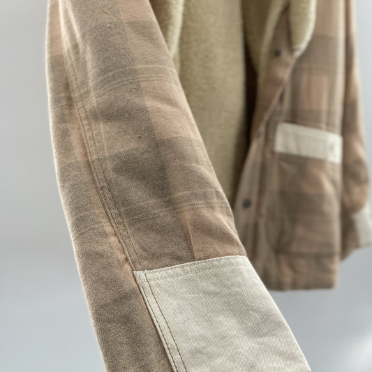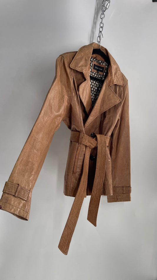Tan Belted, Double Breasted Trench Coat with Plaid Colorful Graphics and Contrasting Black Zippers (C)(M)