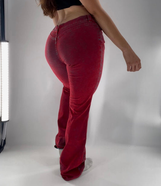 Vintage BISOU BISOU Red Burnt Velvet Low Rise Kick Flare Jeans (6)(C)