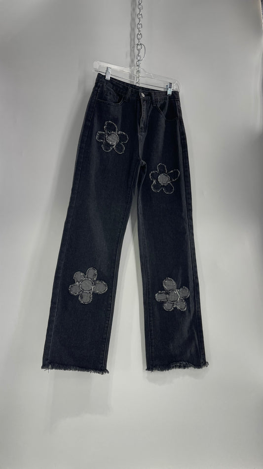 Gray Kickflare Jeans with Distressed Flower Patches (XS)