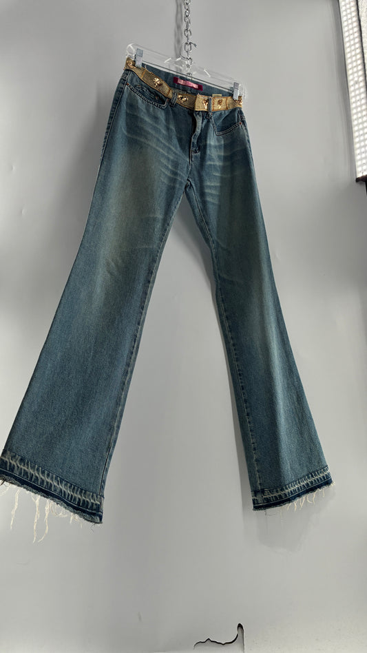Vintage VOYAGE PASSION Kick Flare Light Wash Jeans with Heart Embroidered Bum and Gold Sequin Belt (28)Precio habitual $78.00Precio habitualPrecio unitario por$129.00Precio de oferta $78.00Oferta