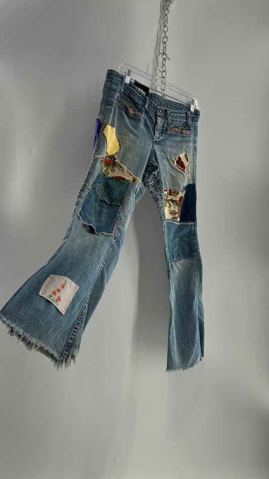 Vintage Rare 1970s Light Wash, Low Rise Boot Cut Jeans with Hand Stitched Tapestry Style Patches and Purple Heart on Bum (Measurements Below)