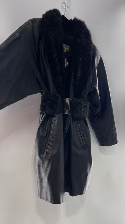 FITZWRIGHT Vintage Black Leather Coat with New Zealand Opposum Fur Collar and Faux Fur Belt (C)(Large)