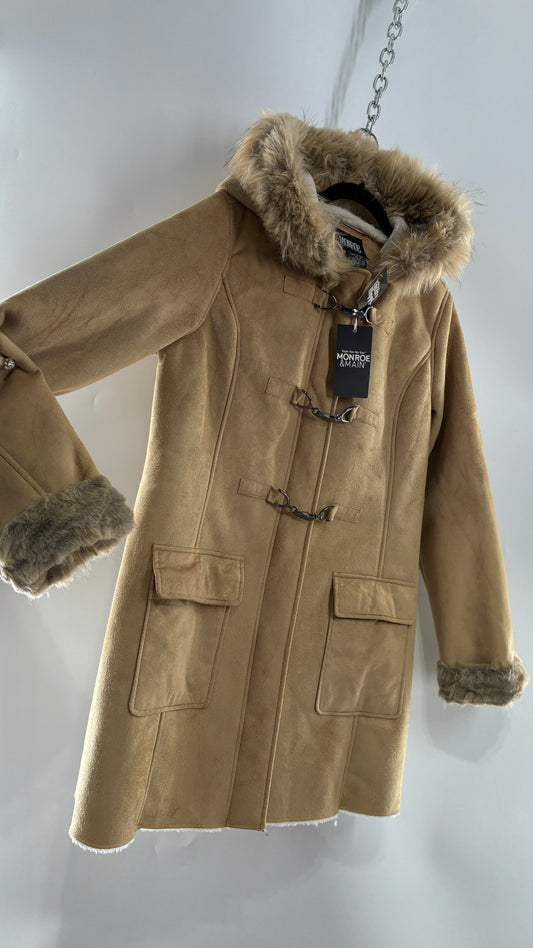 Deadstock Vintage MONROE AND MAIN Vegan Suede Coat with Fur Cuffs and Hood, Tags Attached (Medium)