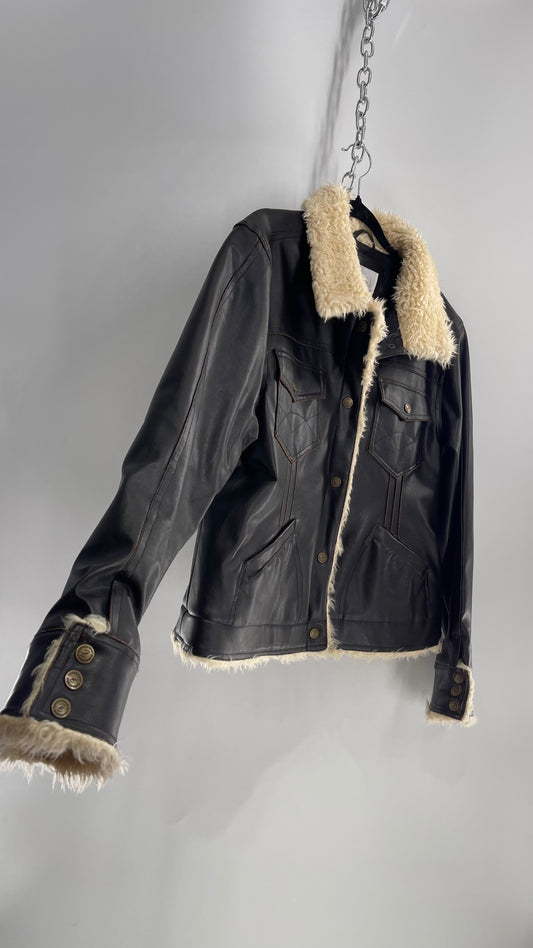 Vintage 90s KC Collections Brown Vegan Leather Jacket with Faux Fur Trim (XL, fits like a M/L)