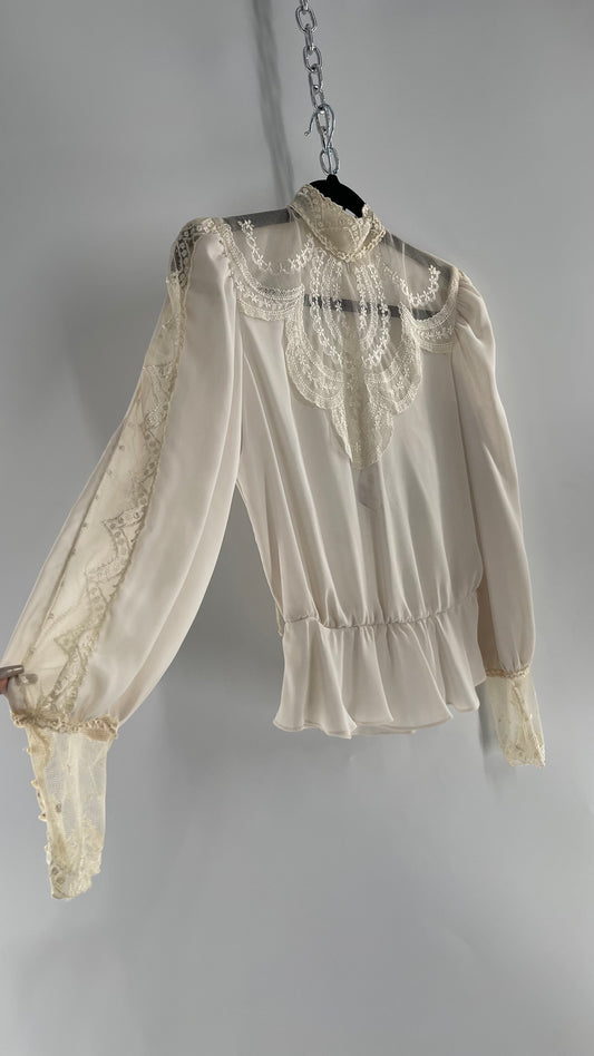 Vintage 1950s Victorian Handmade Blouse with Lace Bust and Cuffs, Buttoned Back Detail and Peplum Hem (M)