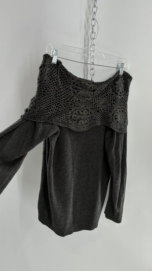 Vintage ELENA MIRO 29% Virgin Wool 8% Angora Wool 8% Cashmere Grey Off the Shoulder Crochet Band Sweater (Medium)